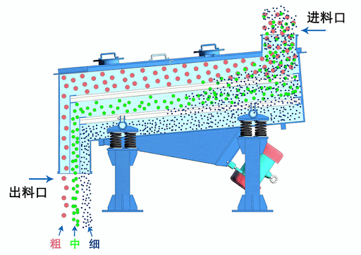 工業(yè)廢料振動(dòng)篩工作時(shí),我們從進(jìn)料口位置將廢料投入篩機(jī)內(nèi)部,可以人工投料,也可以對(duì)接上游設(shè)備自動(dòng)投料,在雙振動(dòng)電機(jī)的驅(qū)動(dòng)下產(chǎn)生的振動(dòng)力傳遞到篩面,廢料受振動(dòng)力影響在篩面上被拋起或向前做直線運(yùn)動(dòng),小于篩孔的廢料通過(guò)篩上,成為篩下物料,大于網(wǎng)孔的廢料被攔截從當(dāng)前出料口排出,這樣就完成了廢料的篩分,分級(jí)。